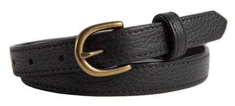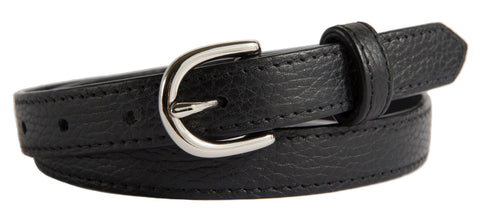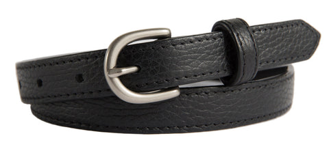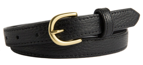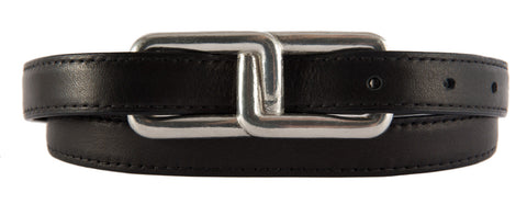 Our Soho belts offer a contemporary twist on a classic belt. This buckle is made of solid brass and comes in 4 finishes -- shiny silver, brushed (matte) silver, gold, and antiqued brass.This 0.75-inch skinny belt is great for dresses/skirts or dress pants.