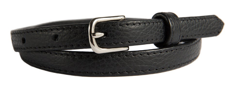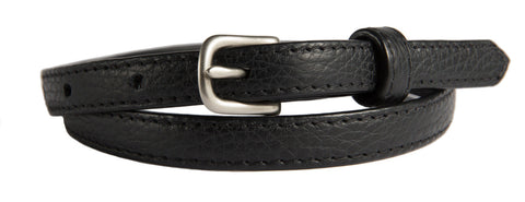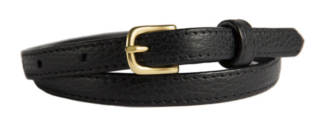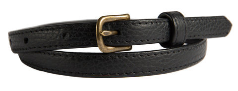 Our Noho belts offer a contemporary twist on a classic belt. This buckle is made of solid brass and comes in 4 finishes -- shiny silver, brushed (matte) silver, gold, and antiqued brass. This 0.5-inch super skinny belt is great for dresses.