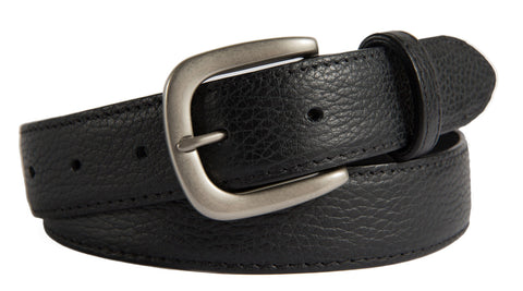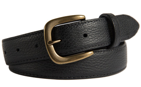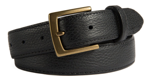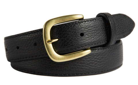Our Hudson belts offer a classic everyday look. This buckle is made of solid brass and comes in 4 finishes -- shiny silver, brushed (matte) silver, gold, and antiqued brass.This 1.25-inch width belt is super versatile -- great for jeans, dresses, or dress pants.